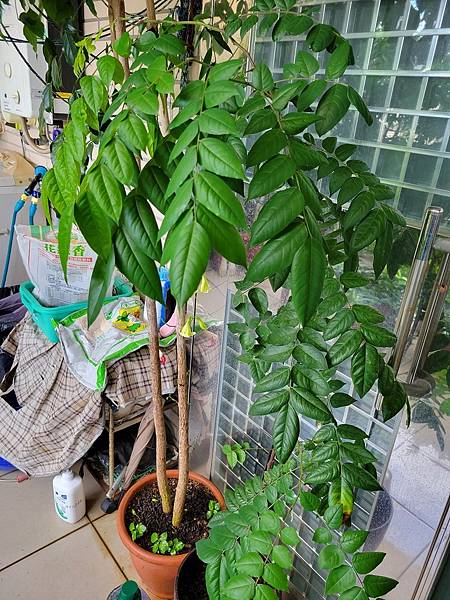 隔壁有開花的是海南菜豆樹(海南菜豆樹又叫發財樹)。