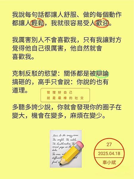 我說出的每句話都讓人舒服、做的每個動作都讓人輕鬆,我就很容易受人歡迎。