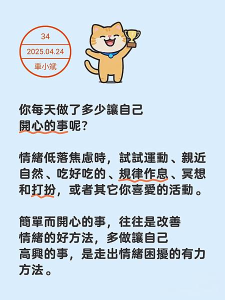 情緒低落焦慮時,試試運動、親近自然、吃好吃的、規律作息、冥想和打扮,或者其它你喜愛的活動。