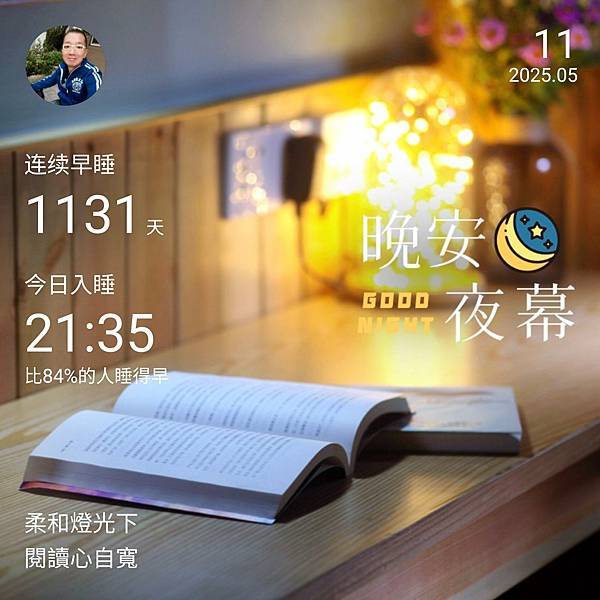 ⬆️晚安打卡圖 2025.05.11 柔和燈光下,閱讀心自寬。