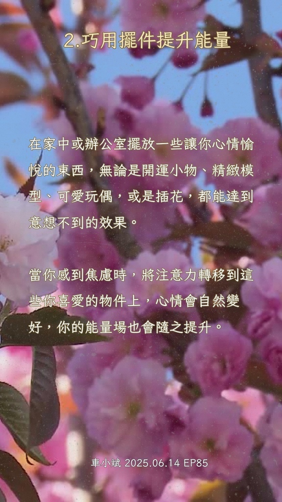 在家中或辦公室擺放一些讓你心情愉悅的東西,無論是開運小物、精緻模型、可愛玩偶,或是插花,都能達到意想不到的效果。當你感到焦慮時,將注意力轉移到這些你喜愛的物件上,心情會自然變好,你的能量場也會隨之提升。