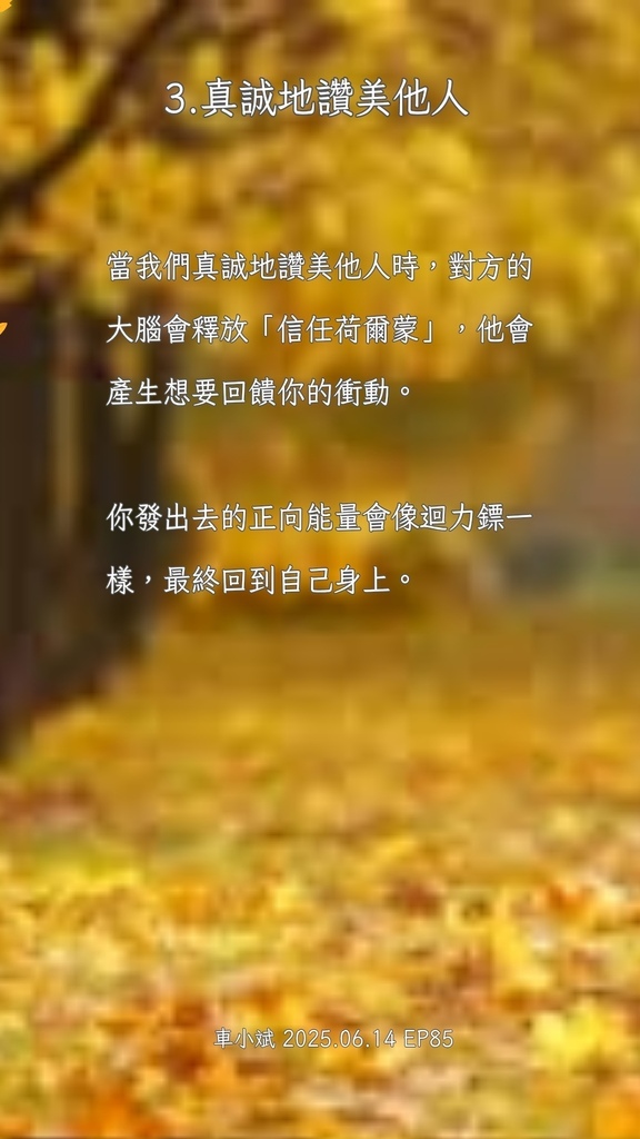 當我們真誠地讚美他人時,對方的大腦會釋放「信任荷爾蒙」,他會產生想要回饋你的衝動。你發出去的正向能量會像迴力鏢一樣,最終回到自己身上。