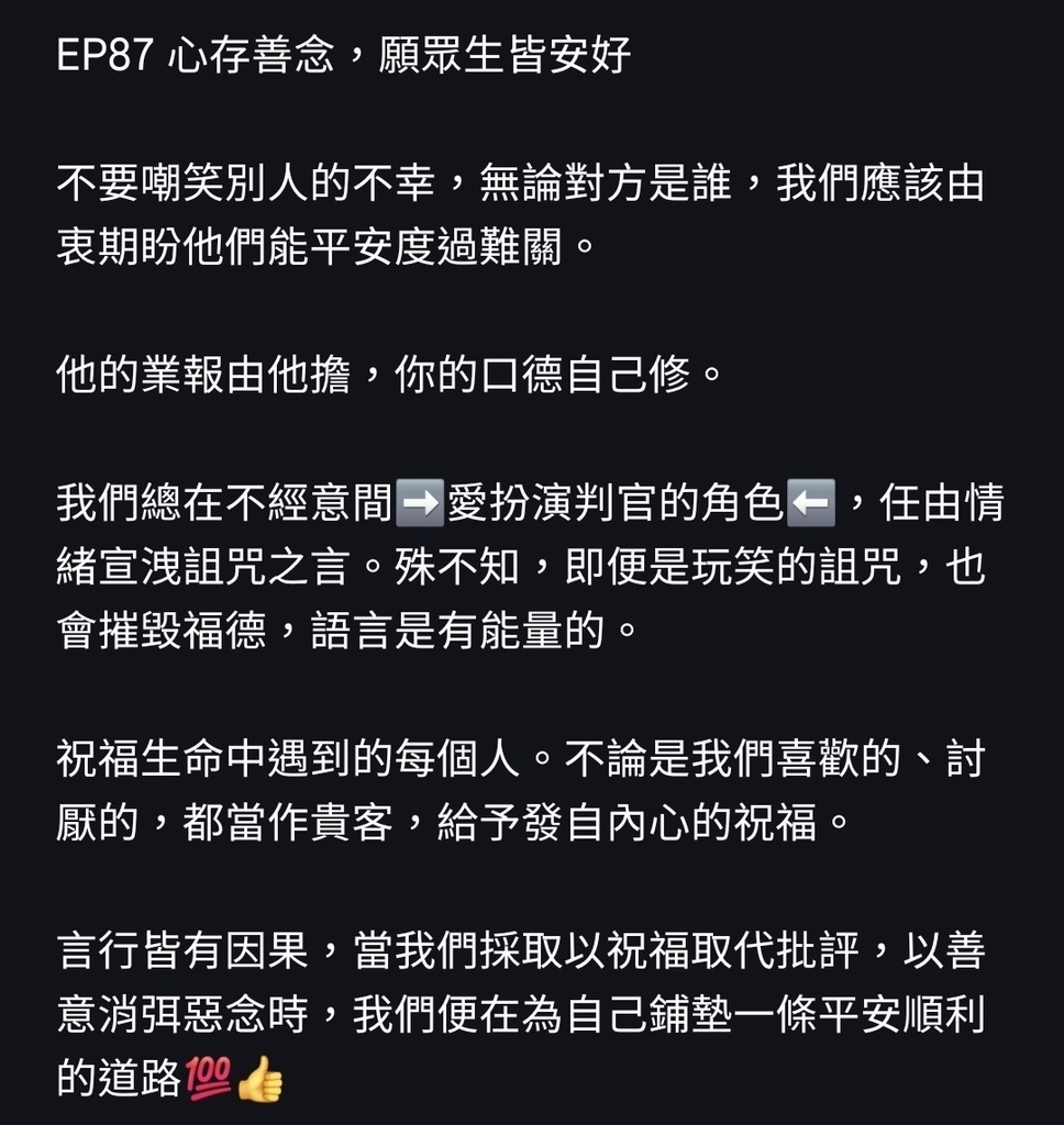 言行皆有因果,當我們採取以祝福取代批評,以善意消弭惡念時,我們便在為自己鋪墊一條平安順利的道路💯👍