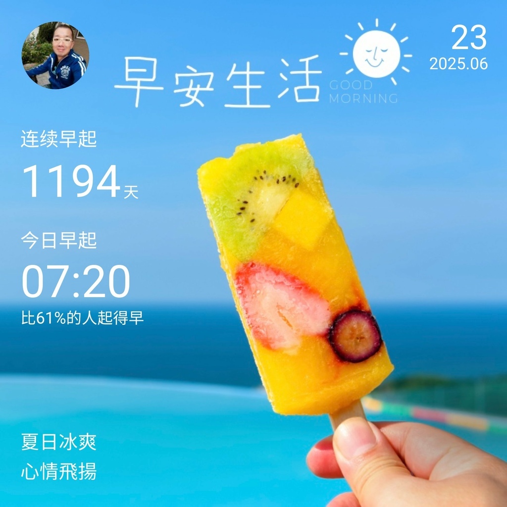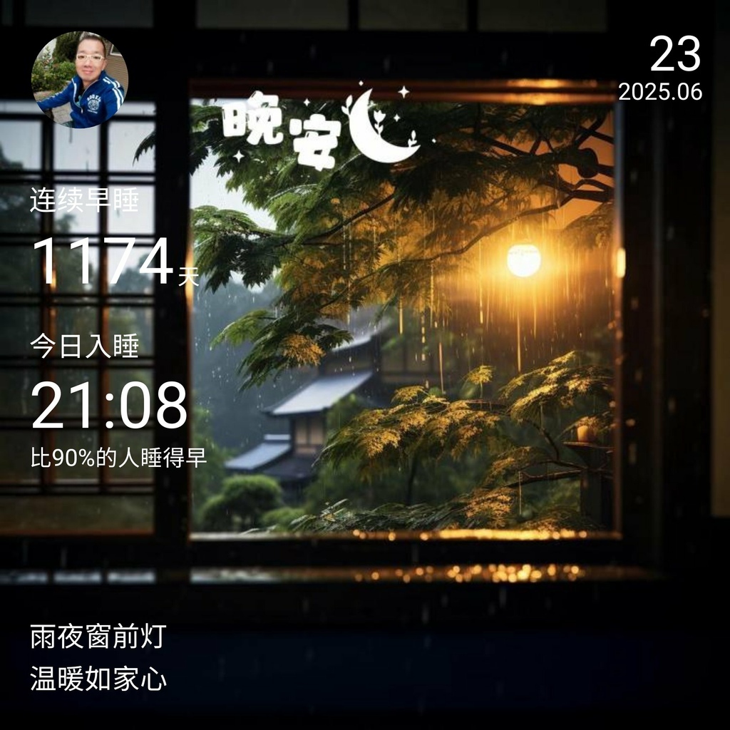 ⬆️早安打卡圖,2025.06.23,夏日冰爽,心情飛揚 ⬇️晚安打卡圖,2025.06.23,雨夜窗前燈,溫暖如家心