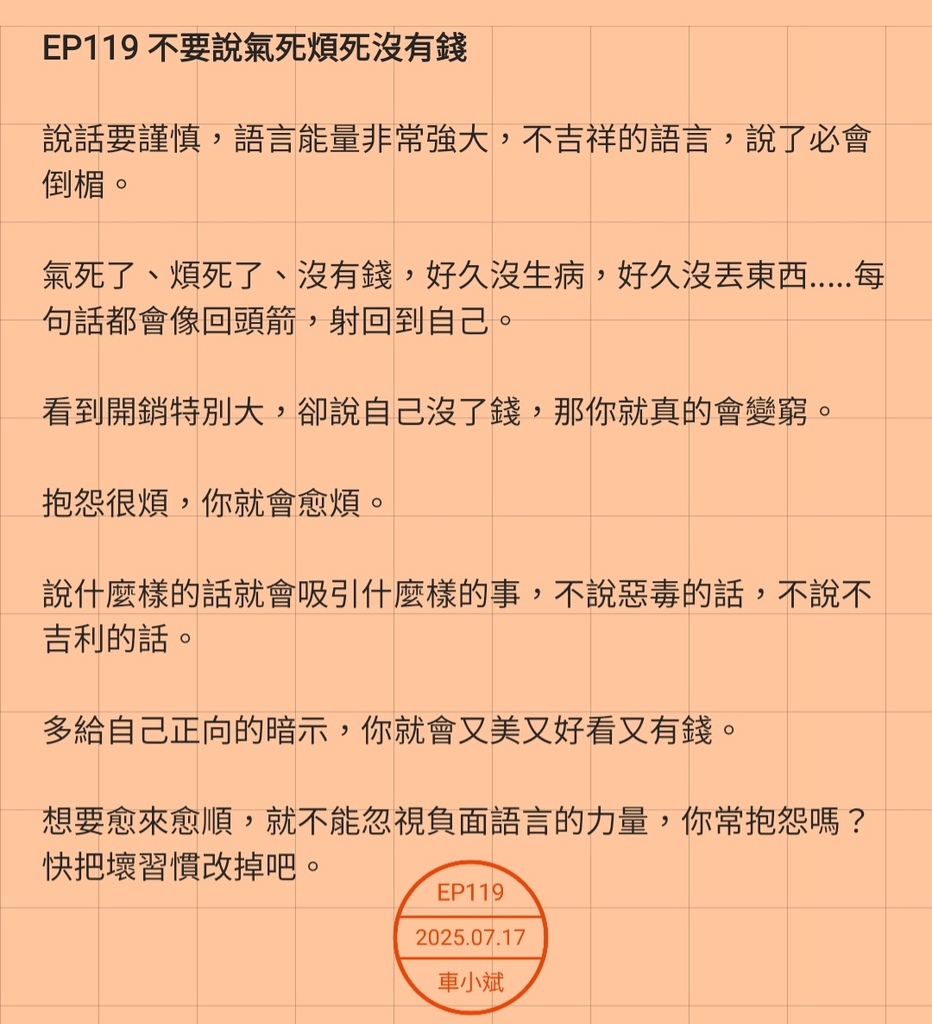 氣死了、煩死了、沒有錢,好久沒生病,好久沒丟東西.....每句話都會像回頭箭,射回到自己。