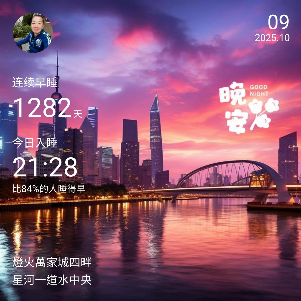 ⬆️晚安打卡圖,2025.10.09,燈火萬家城四畔,星河一道水中央
