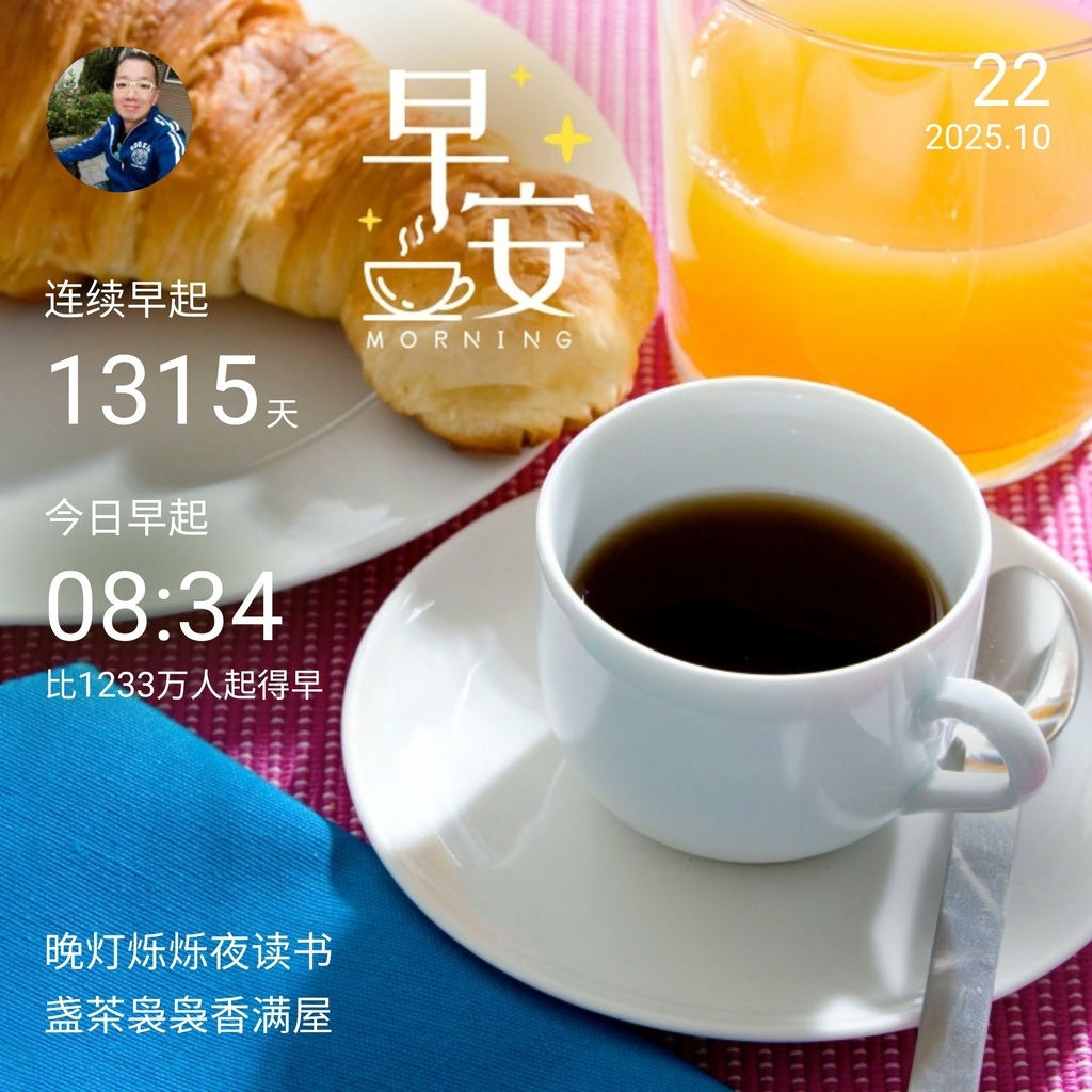 ⬆️早安打卡圖,2025.10.22,晚燈爍爍夜讀書,盞茶裊裊香滿屋